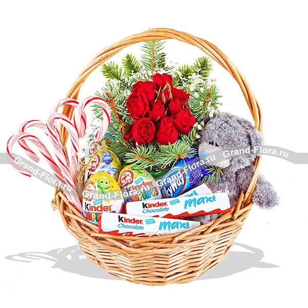 Стандартный (на фото): роза красная кустовая - 2 шт., гипсофила - 2 шт., еловая ветвь, Мишка Teddy - 20 см, рождественские конфетки - 5 шт., Kinder Сюрприз - 4 шт., Kinder Chocolat max - 4 шт., MilkaWay - 1 шт., оазис, корзина средняя.
