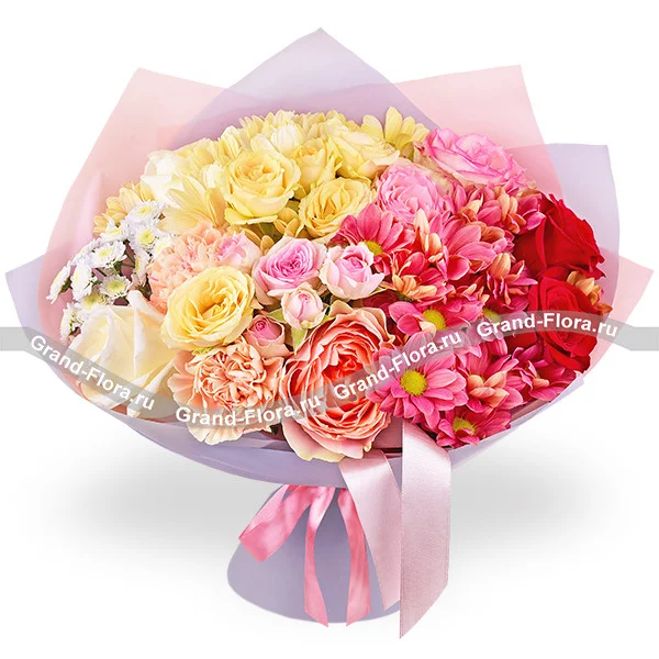 Стандартный: роза красная - 2 шт., роза розовая - 2 шт., роза белая - 2 шт., роза персиковая-1 шт., хризантема кустовая розовая - 1 шт.,хризантема кустовая ромашковая кремовая - 1 шт., роза кустовая розовая - 1 шт., кустовая роза кремовая - 2 шт., хризантема сантини - 1 шт., гвоздика персиковая - 2 шт., упаковка, лента.