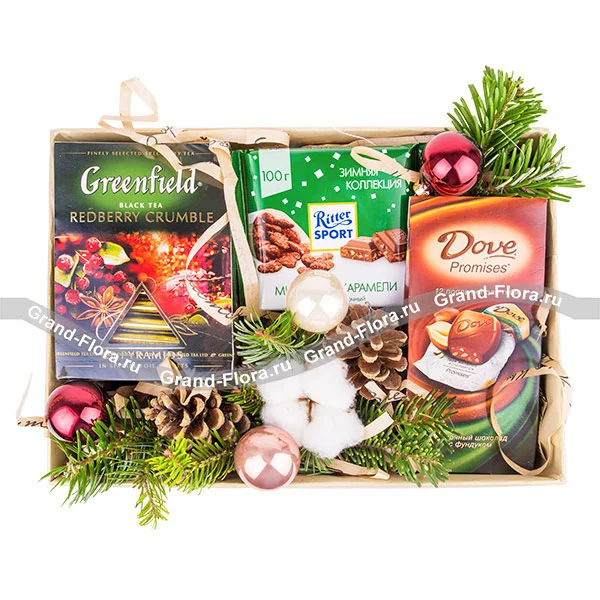 Стандартный: чай "Greenfield" - 1 шт., шоколад "Ritter Sport" - 100 гр., шоколад "Dove Promises" - 1 шт., шишка - 2 шт., хлопок - 1 шт., новогодний декор, ель, коробка.